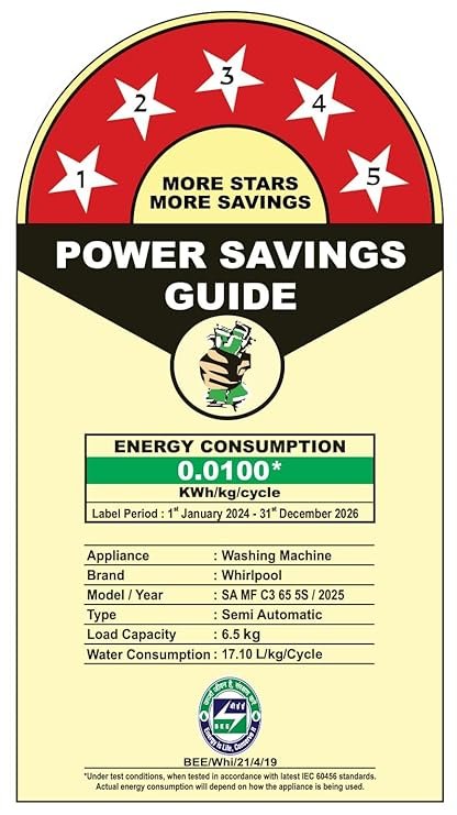 Energy Rating 5 Star: Best in class efficiency | Energy consumption – 0.0100* KWh/kg/cycle (Please refer BEE label for more information), Model/Year : SA MF C3 65 5S/2025